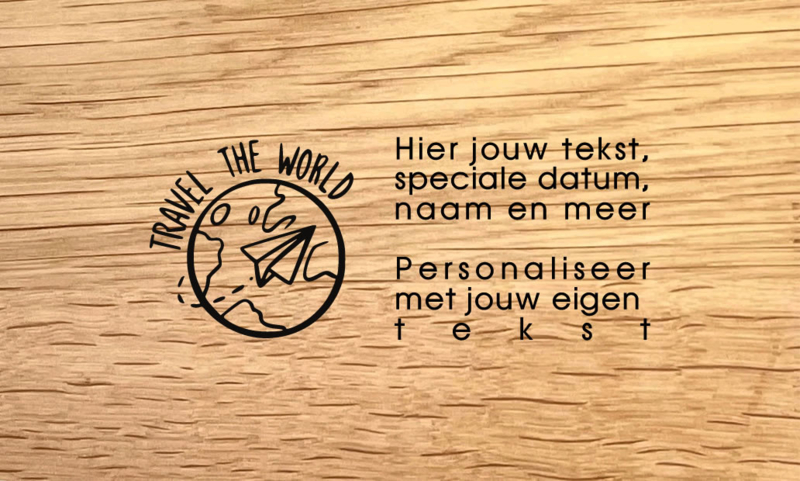 Bij het bestellen kun je aangeven welke steden, reisdatums, teksten of namen je wilt laten graveren bij de wereldbol met de tekst "Travel the World". Na het plaatsen van een bestelling ontvang je per mail een digitaal voorbeeld van het gepersonaliseerde ontwerp zodat je precies kunt zien hoe jouw unieke cadeau eruit zal zien.