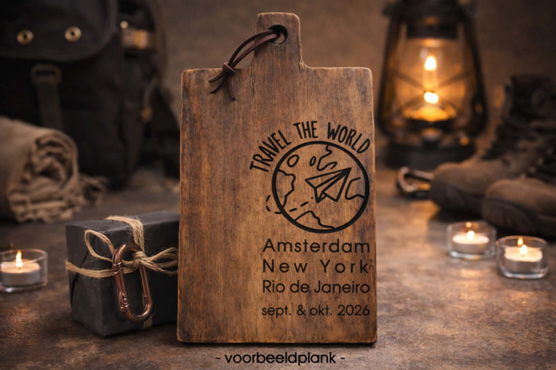 Borrelplank Travel The World - Reis & Avontuur graveringen