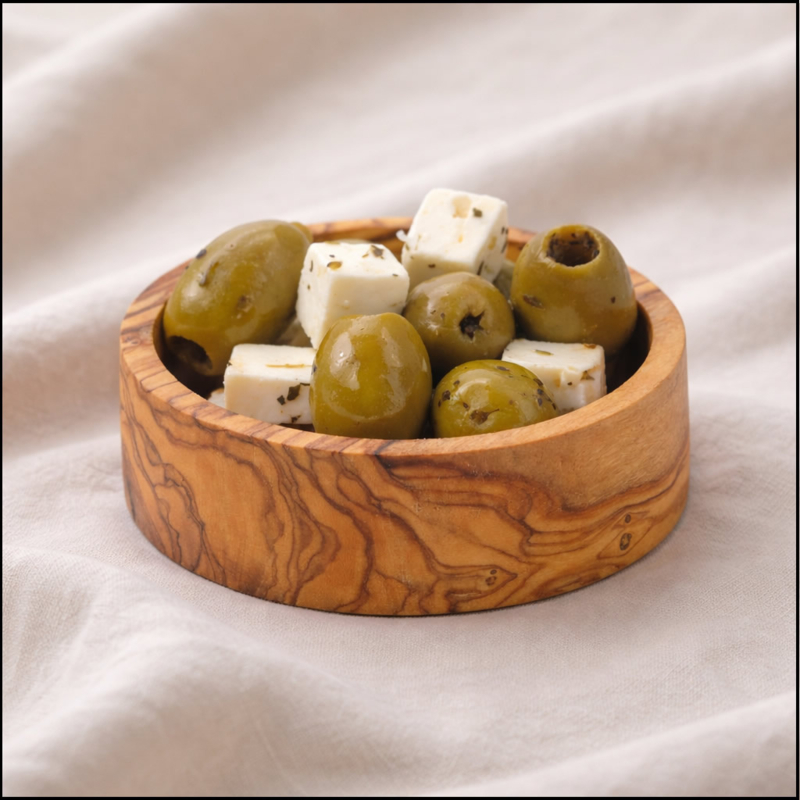 Elk schaaltje is uniek, gemaakt van natuurlijk olijfhout en perfect voor het serveren van kleine borrelhapjes zoals olijven, nootjes, kaasblokjes of tapas.