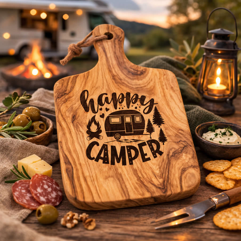 Ben je op zoek naar een origineel cadeau voor een camperaar of kampeerder? Met de Happy Camper borrelplank geef je een persoonlijk cadeau dat perfect past bij het buitenleven.
