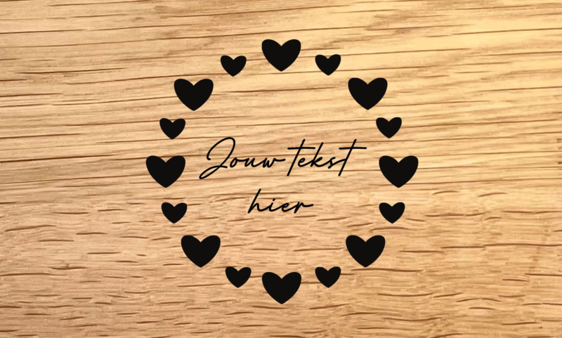 Design D is ontworpen als een symbool van liefde en vriendschap. De cirkel van hartjes vormt het perfecte kader voor de naam van de jarige en haar leeftijd – een verfijnd ontwerp dat elegant oogt op iedere houten borrelplank.