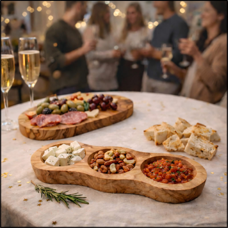 OverzichtOlijfhouten Borrelschaal met 3 Vakken – Handgemaakte Serveerschaal van Olijfhout