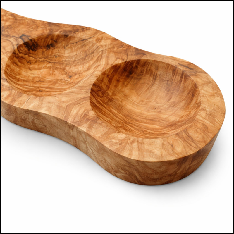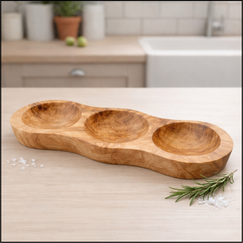 Borreltrio – Olijfhouten Borrelschaal met 3 Vakken